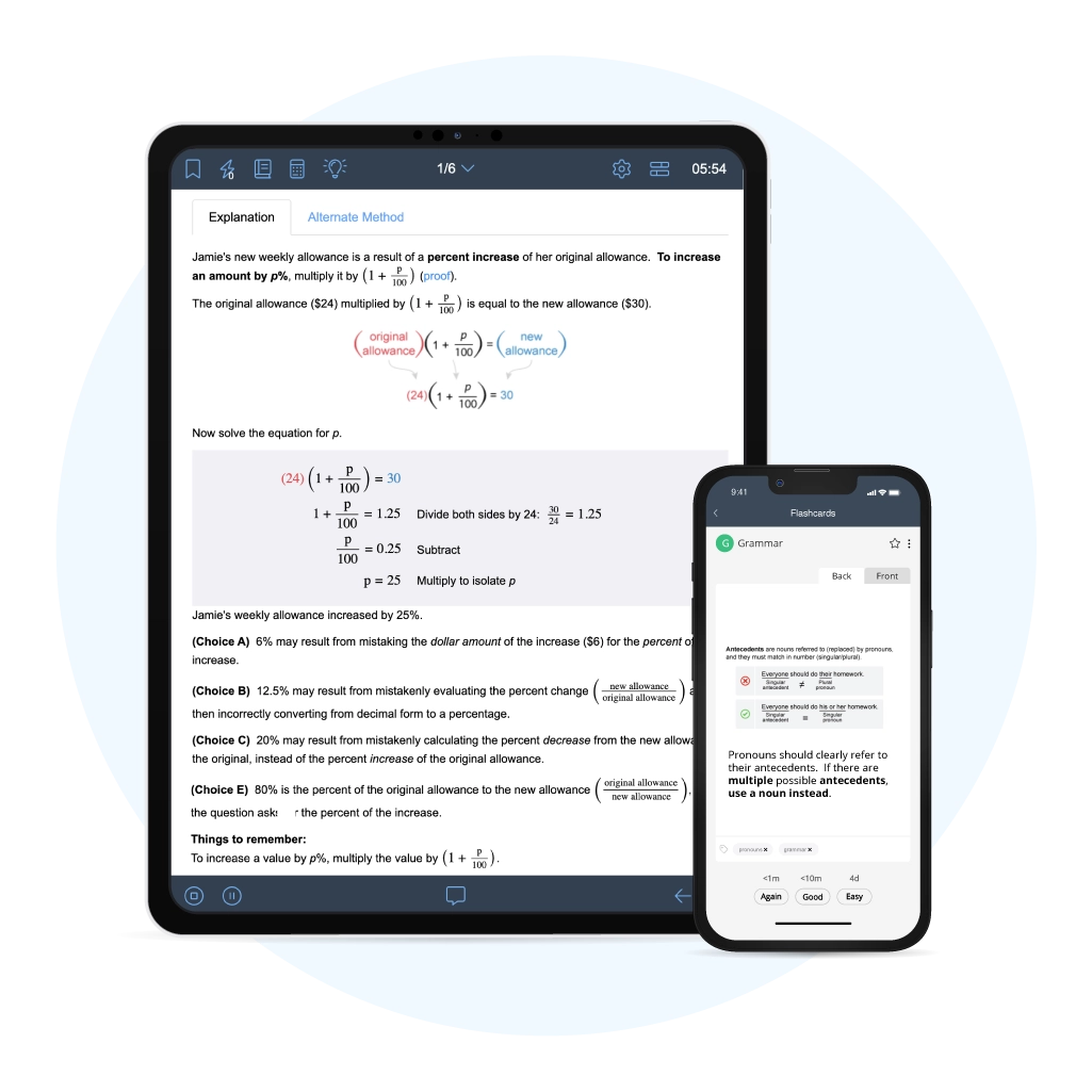 Our prep books, available in both print and digital formats, provide a clear and efficient way to review every subject, topic, and concept on the exam. With built-in knowledge checks per topic, you can quickly identify weak areas, reinforce what you’ve learned, and stay on track. These comprehensive study materials are included with your online ACT preparation course, so you can stay organized and on track every step of the way.
