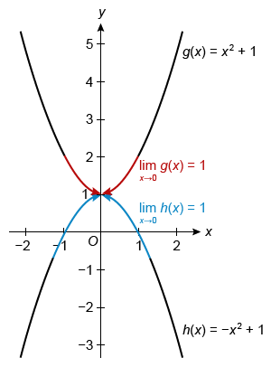 The functions g(x) = x2 + 1 and h(x) = −x2 + 1 only approach the same value as x approaches 0, so it is possible to apply the squeeze theorem at x = 0.