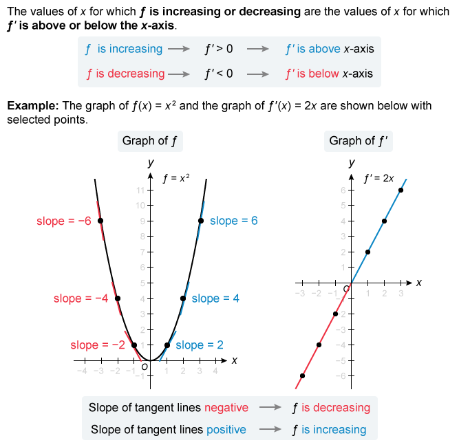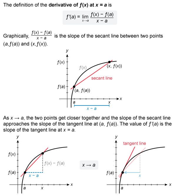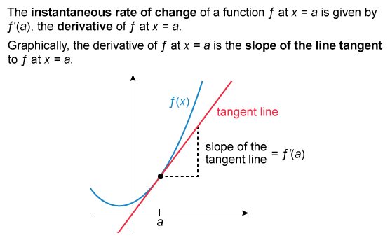- The slope of the line tangent to a function is the value of the derivative of .