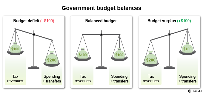 A government's budget is balanced when tax revenues equal its spending, which includes transfer payments. A budget surplus results when the value of government spending is less than the value of tax revenues.
