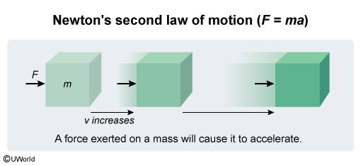 According to Newton's second law of motion, the sum of the forces ΣF on an object equals the product of the object's mass m and acceleration a: