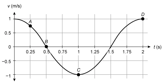 A graph of the velocity as a function of time for an object is shown above. If the object is at x = 0 m at time t = 0 s, at which of the labeled points does the object have the greatest magnitude of displacement and acceleration?