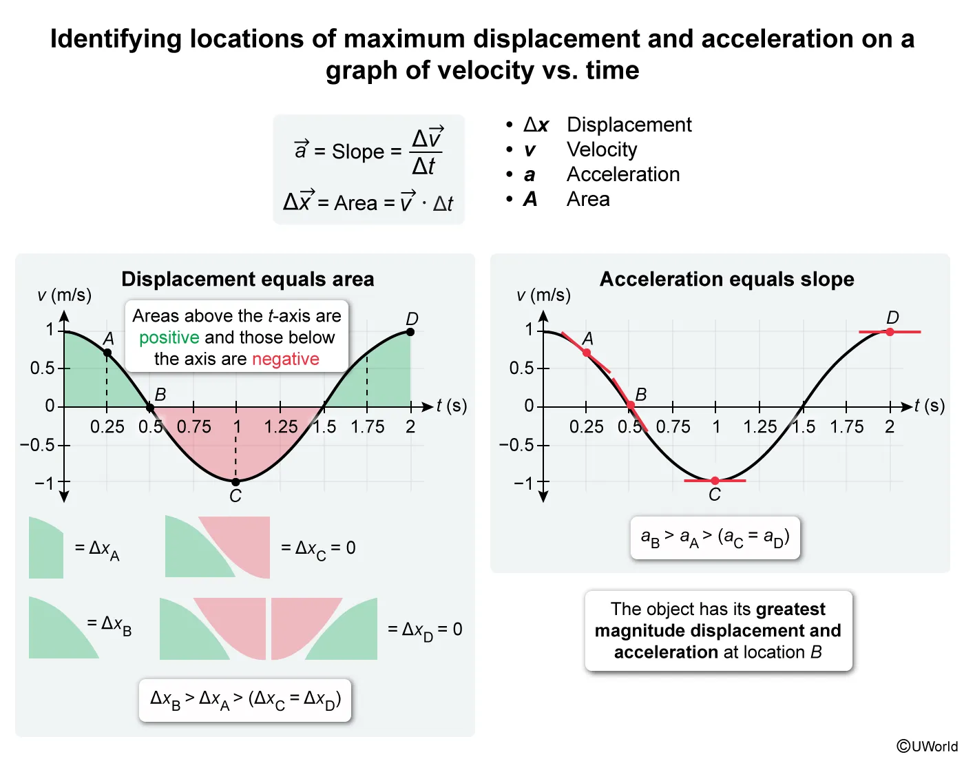 (Choice A) The displacement and acceleration have a smaller magnitude at location A than at B because the slope of the graph and the area beneath the graph are smaller at A than at B.