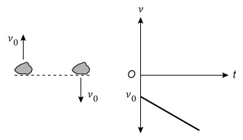 Both rocks are thrown at the same initial speed, but they are thrown in opposite directions. Hence, the rock that is thrown vertically upward has an initial velocity of +v0. The velocity of this rock as a function of time t is: