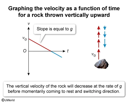 Therefore, the velocity vs. time graph for this rock will show a positive initial velocity v0 with a downward slope equal to g, as shown in the graph for Choice C.
