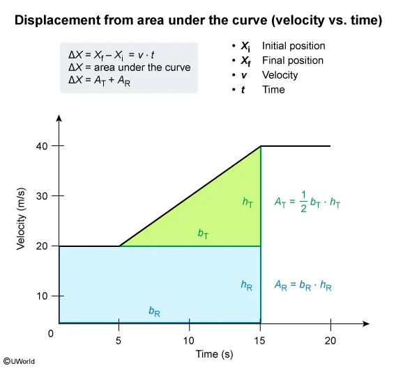 In addition, the total area beneath the curve on a graph of velocity as a function of time equals the displacement of the object, where areas above and below the t-axis represent positive and negative displacement, respectively.