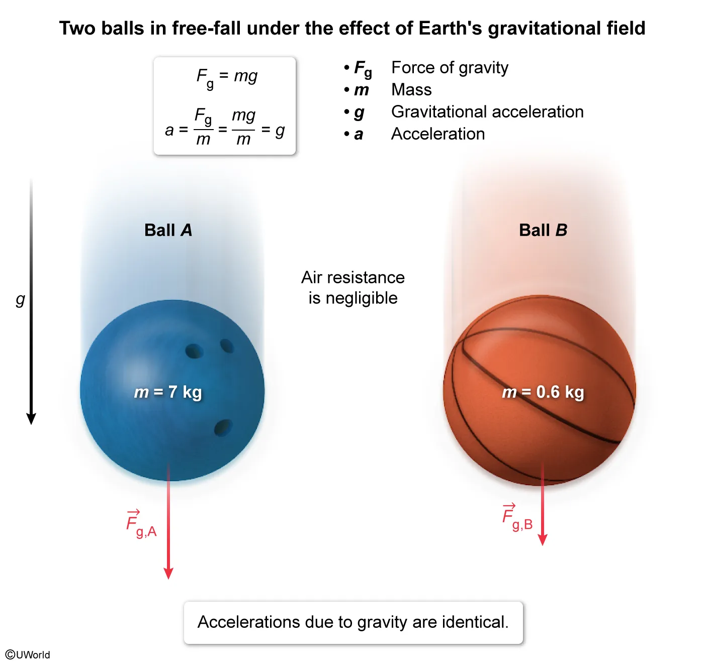 An object is in free-fall when it is subject only to the downward force of gravity. The acceleration a of an object in free-fall near Earth's surface is also downward and is equal to the free-fall acceleration constant g: