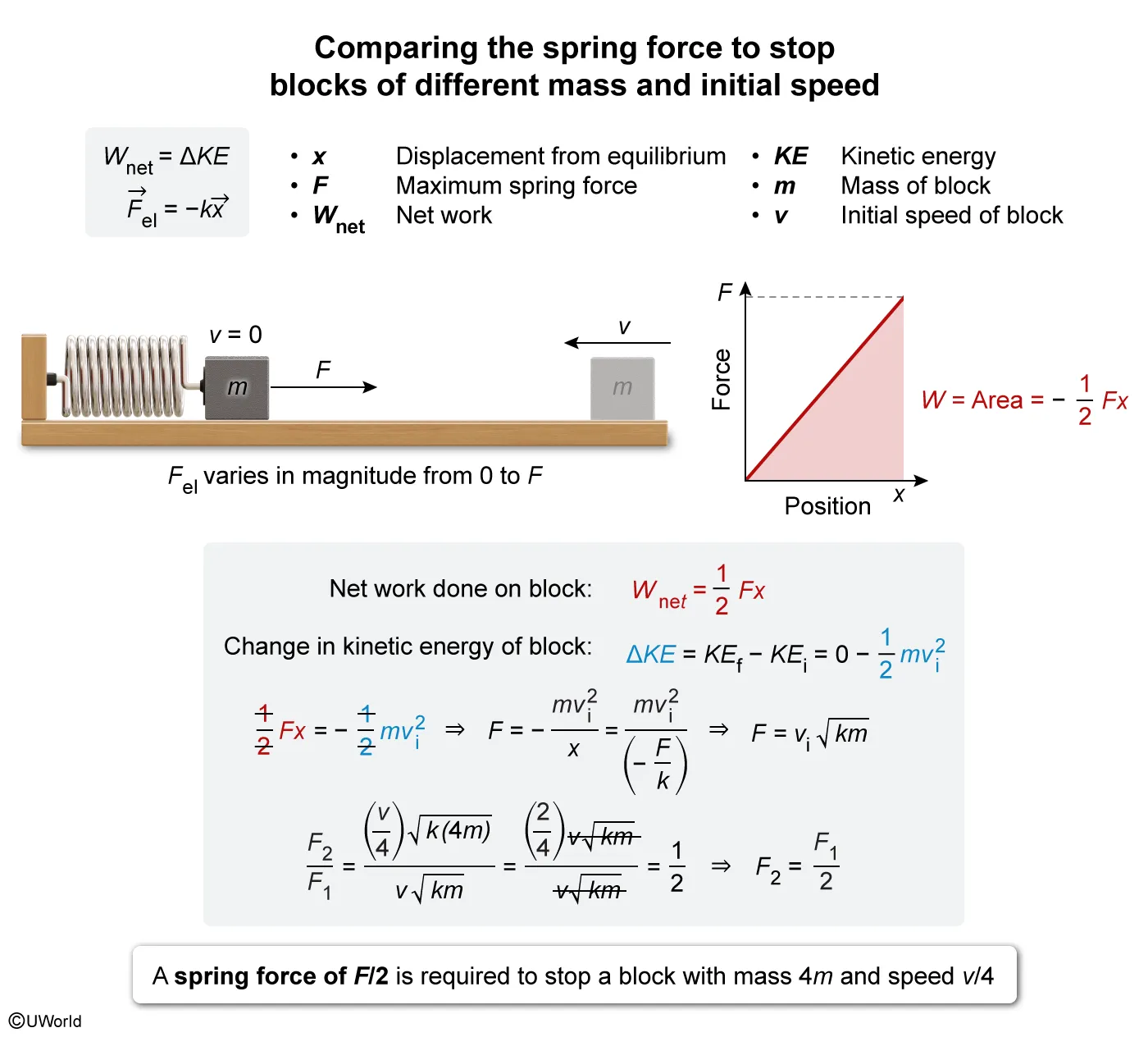 In this question, the spring force varies linearly in magnitude from 0 to F as the spring compresses. Hence, the work Wnet on the block is equal to the area beneath the graph of force as a function of position (i.e., the area of the triangle):
