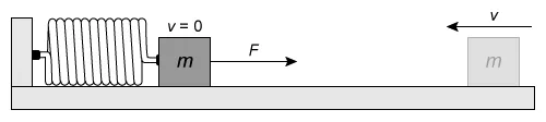 A block of mass m slides across a frictionless surface with a speed v until it collides with a spring that is initially uncompressed. At the instant the block comes to rest, the compressed spring exerts a force F on the block, as shown in the figure above. The spring is then reset, and the experiment is repeated with a second block of mass 4m and speed v/4. What is the maximum spring force required to stop the second block?