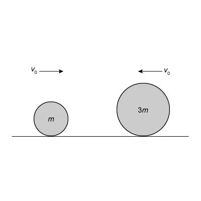 A collision takes place between balls of mass m and 3m, as shown above. The balls are initially traveling at the same speed v0 and move together to the left with velocity vf after colliding. Which of the following compares the kinetic energy KE and momentum p of the two-ball system before and after the collision?