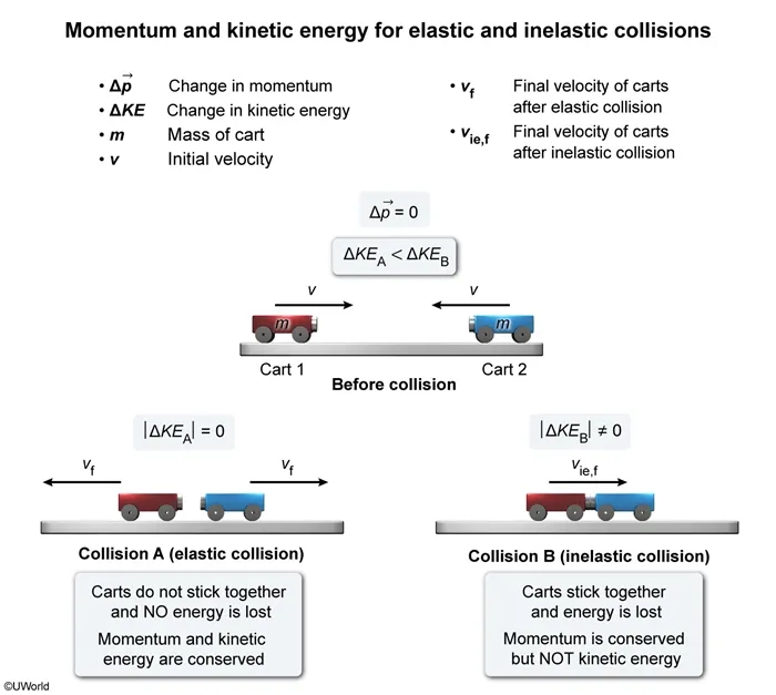 In this question, the type of collision dictates whether kinetic energy (KE) is also conserved or not. In an elastic collision, no energy is lost due to the interaction of objects with each other, and in collision A, the total kinetic energy KE of the carts before and after the collision is equal: