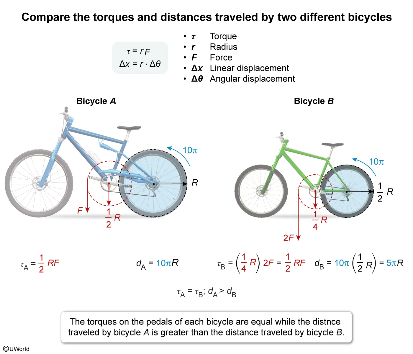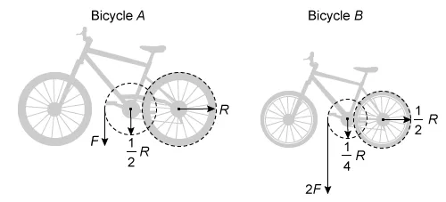 In this question, two students push the pedals on two different bicycles starting from rest. Bicycle A receives a force on its pedals with radius and back wheel radius . Bicycle B receives a force on its pedals with radius and back wheel radius . The torques and exerted on bicycles A and B are the product of the forces and the radial values: