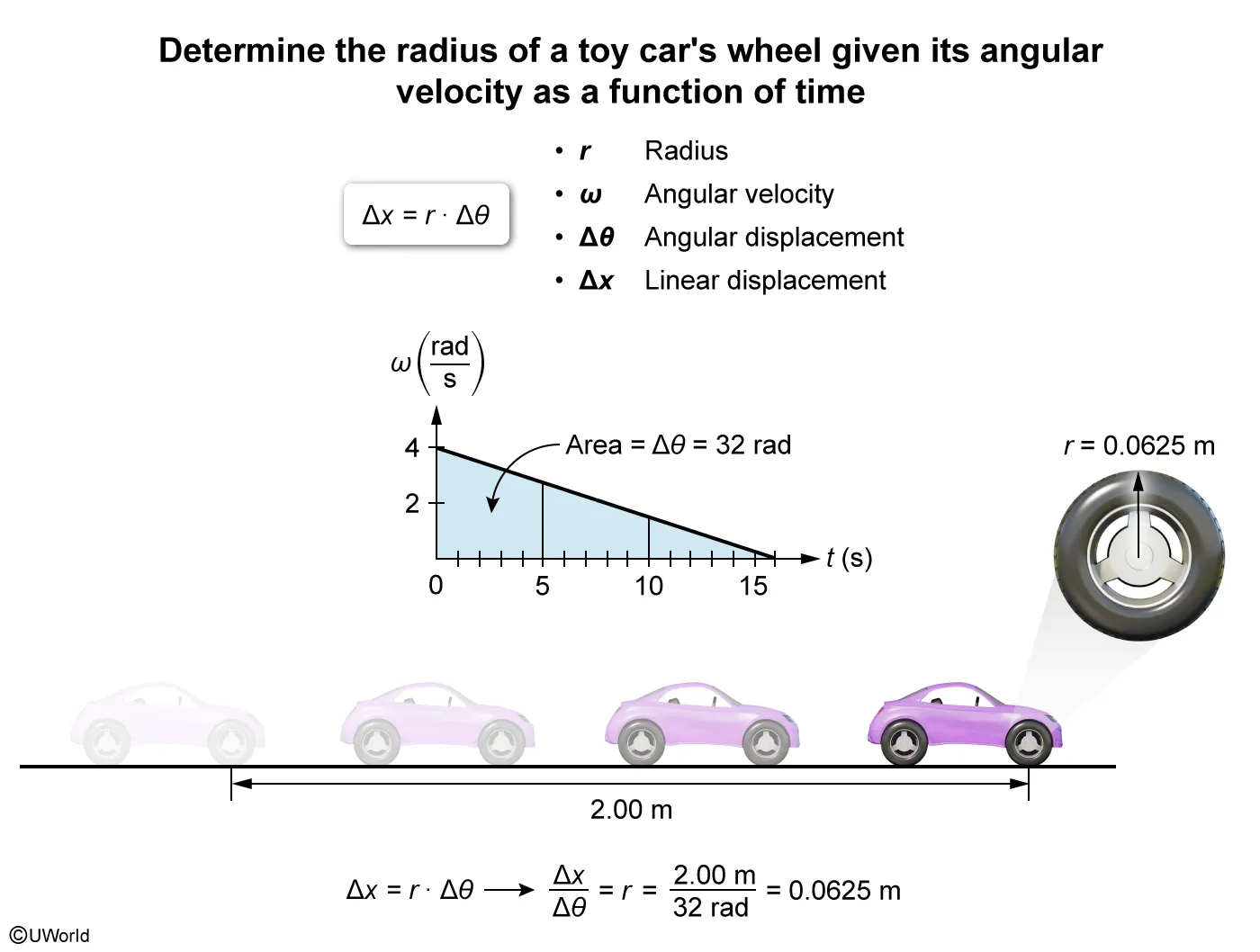 Hence, the wheel has 32.0 rad of total angular displacement. The radius of a wheel is equal to the ratio of the linear displacement of the car and the angular displacement of the wheel:
