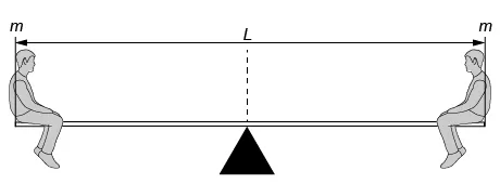 In this question, two students each of mass sit on opposite ends of a balanced seesaw of negligible mass and length with the fulcrum located at the center. An additional student of mass then sits on the right side of the seesaw. The weight of each student causes a torque on the seesaw equal to the product of their respective weight and the distance to the fulcrum, :