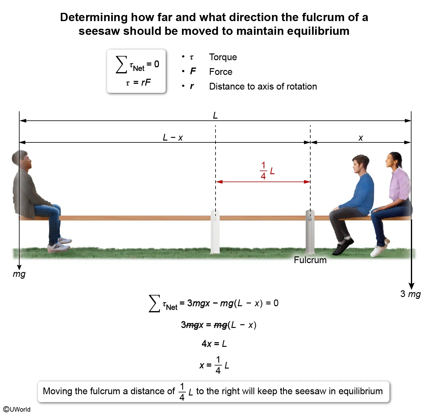 The distance to the fulcrum for the two students sitting on the right end of the seesaw can be defined as , giving the distance to the fulcrum for the student sitting on the left end as . Thus, the net torque equation for the seesaw can be expressed as: