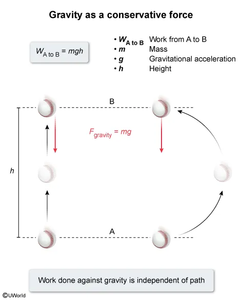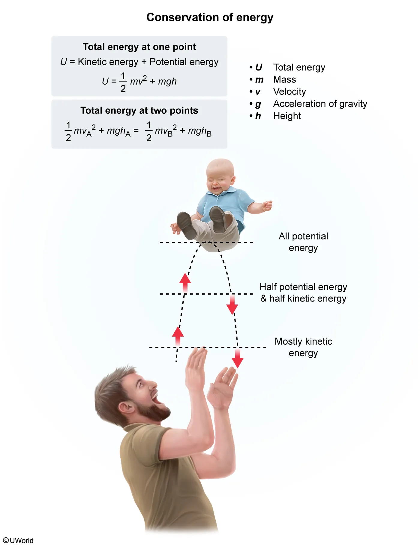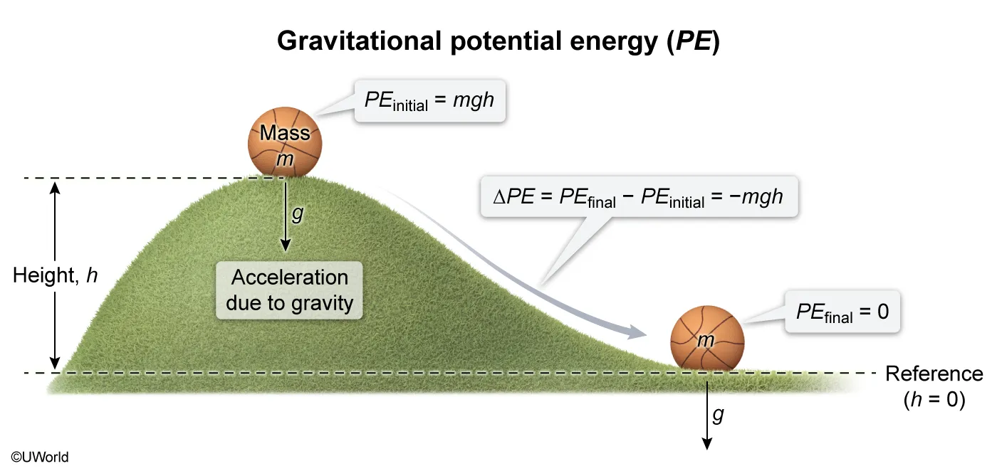 When a system is influenced only by conservative forces (eg, gravity), its total mechanical energy (E) is conserved. This means that the sum of its kinetic energy (KE) and gravitational potential energy (PE) remains constant at all points in time: