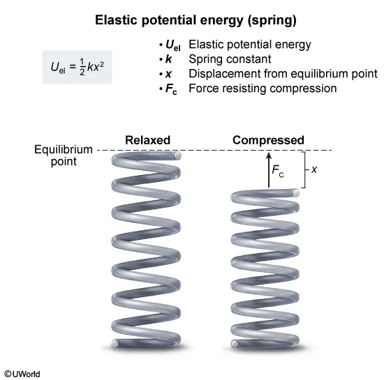 As the elastic force does work on the object, an elastic potential energy Uel, which is equal to half the product of k and the square of the displacement, is stored in the object-spring system: