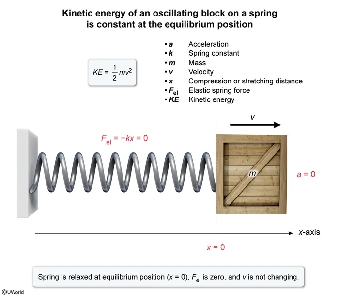 Because the acceleration is zero at the equilibrium position, the instantaneous change in velocity at that time is also zero. Therefore, at the instant the block is passing through the equilibrium position, its kinetic energy is also not changing, ie, the block neither gains nor loses kinetic energy (Choice A).