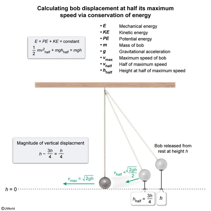 (Choice D) is the bob's height above the lowest point when moving at half its maximum speed. Therefore, the magnitude of the bob's displacement from height h to height is equal to .