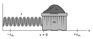 In this question, the container-spring system has maximum elastic potential energy and zero kinetic energy (KE) when the container is released at displacement xm. As the container oscillates, conservation of energy implies the sum of KE and Uel is constant: