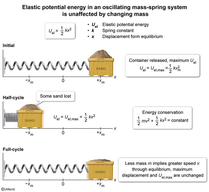 As the system loses elastic potential energy, it gains an equal amount of kinetic energy. When the container reaches displacement −xm, Uel is again a maximum and KE is zero. At this location, some sand is lost and the mass of the container decreases. However, there is no change to the maximum elastic potential energy Uel,max: