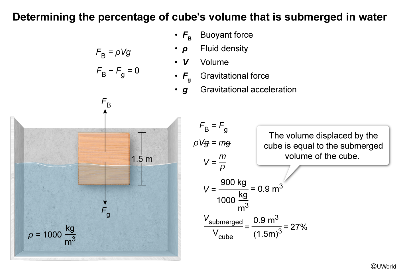Note that is also the volume of the cube submerged under the surface of the water, . Solving for using the cube mass m = 900 kg and density of water ρ = 1,000 kg/m 3 yields: