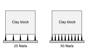 In this question, a soft clay block is put on two even distributions of sharp nails. The first set has 25 nails, whereas the second set has 50 nails, and the block is at rest in each scenario. Newton's third law of motion implies that the block is in static equilibrium when the weight of the block is equal and opposite to the cumulative force applied by the nails :