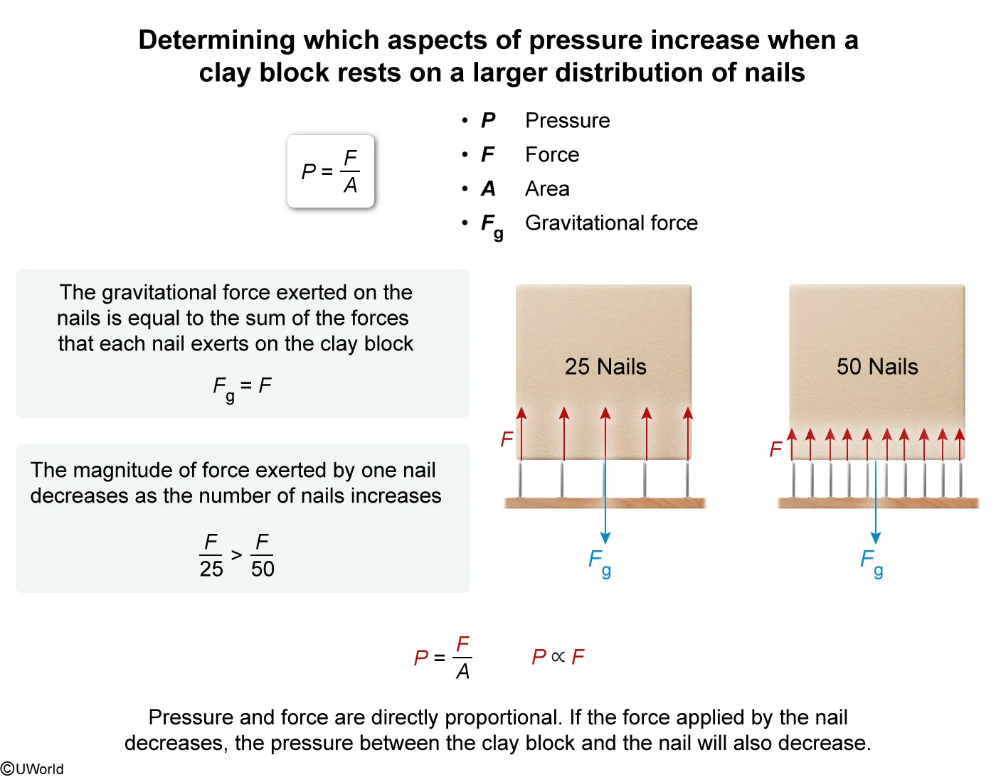With the surface area of the clay block constant, the pressure between the block and the nails is directly proportional to the force exerted by each nail. Therefore, if the force exerted by an individual nail decreases in magnitude, the pressure must also decrease.