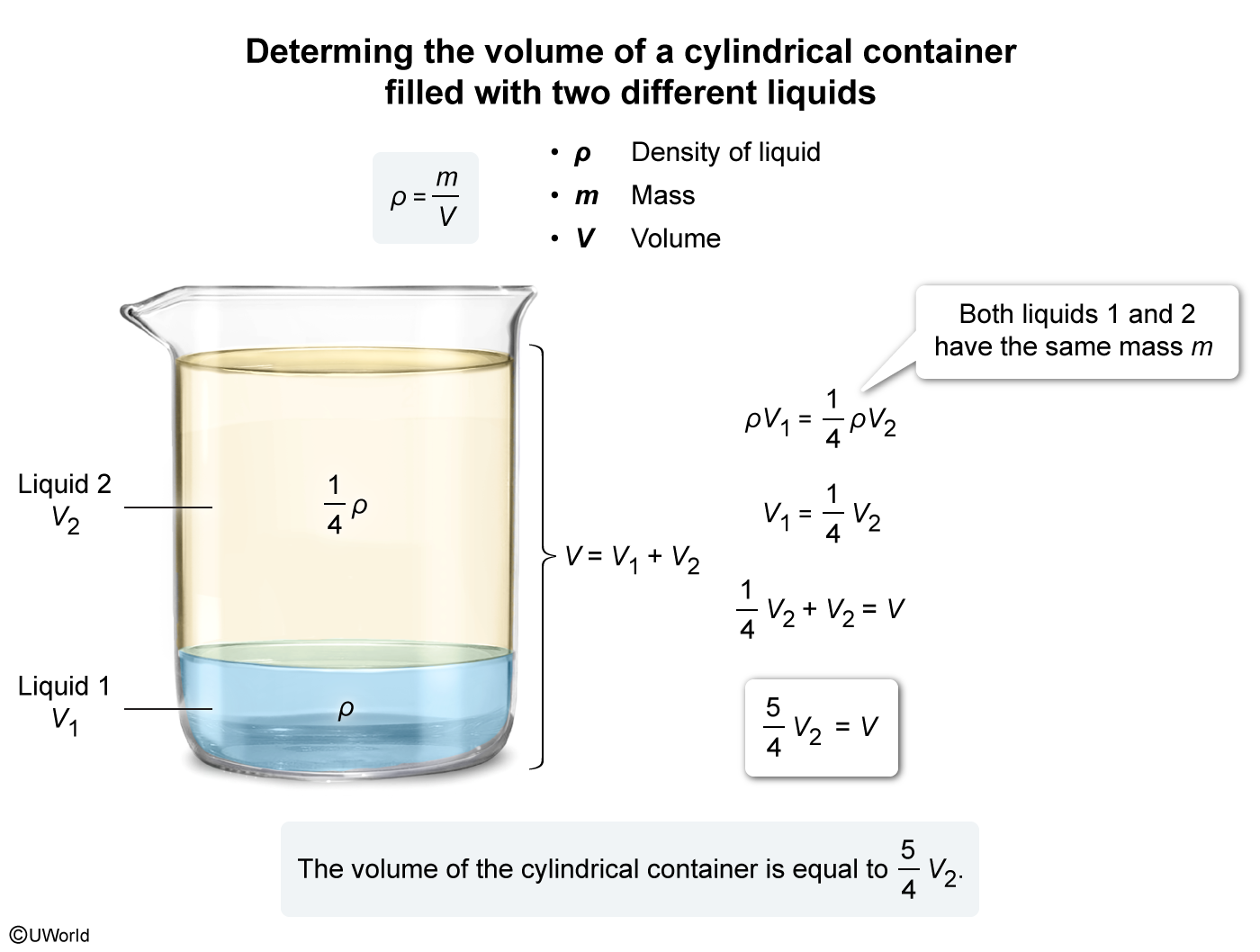 In this question, equal masses of liquid 1 and liquid 2 of densities and , respectively, fill a single cylindrical container of volume . Liquid 1 fills a volume , and liquid 2 fills a volume . The overall volume of the cylindrical container is equal to the sum of both volumes and :