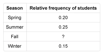 A teacher asked the 20 students in a classroom which season of the year they liked the most. The results of the survey are shown in the relative frequency table below. Notice that the information about students who liked fall the most is missing.