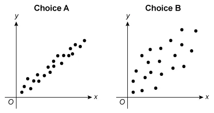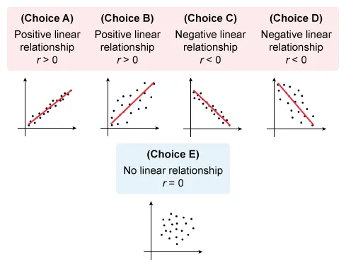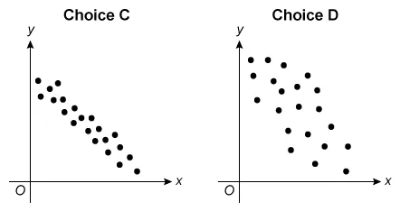 (Choices C and D)These scatterplots show different levels of strength of negative linear relationships (r < 0). However, the question asks for the plot with a correlation closest to 0 (r = 0).