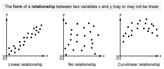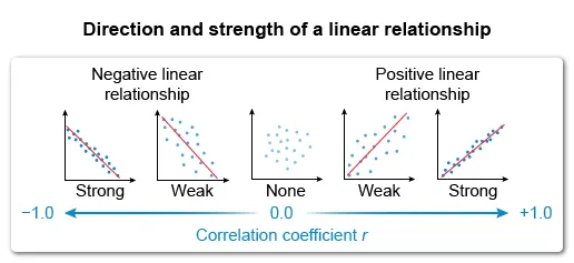 - When two variables x and y do not show a linear relationship, the correlation coefficient r is equal to or close to 0.