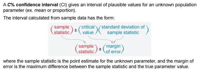 - A confidence interval (CI) gives an interval of plausible values that, with a C% level of confidence, should capture the unknown population parameter.