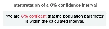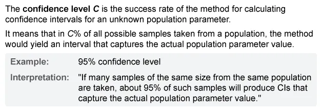 - A C% confidence interval (CI) is a range of plausible values calculated from sample data that captures the true value of a population parameter with a C% confidence level.