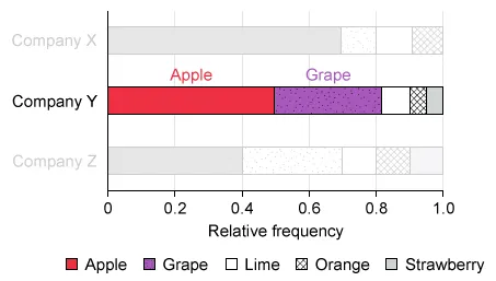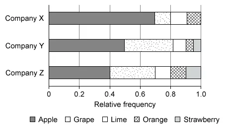 Candy companies X, Y, and Z make boxes of gummies in five fruit flavors. Anna bought a box from each company and determined the number of gummies of each flavor. The graph below shows the relative frequency distribution of flavors for each box of gummies.
