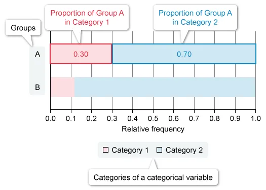 Note: A segmented bar graph of relative frequencies does not allow for a comparison of the number of observations per segment between groups unless the total number of observations in each group is given.