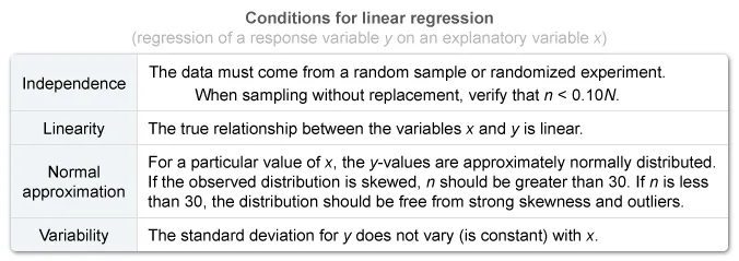 - The conditions for a t-test for the slope to be valid are independence, linear relationship, approximately normal distribution of the response, and constant variability of the response.