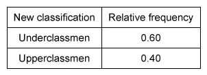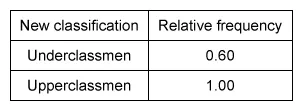 The Office of Academic Affairs decides to reclassify students. It will now group freshmen and sophomores together as underclassmen and group juniors and seniors together as upperclassmen. Which of the following represents the relative frequency distribution of students for the new classification?