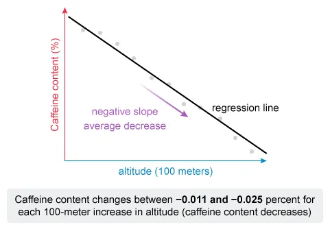 Notice that the given interval (−0.025, −0.011) for the slope of the regression line contains only negative values, so caffeine content decreases (on average) as altitude increases. Eliminate Choices A and D.