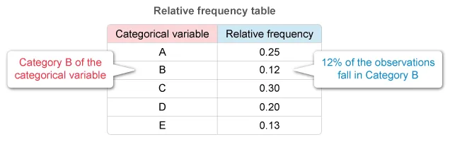 - A relative frequency table gives the proportion of observations that fall into each category.
