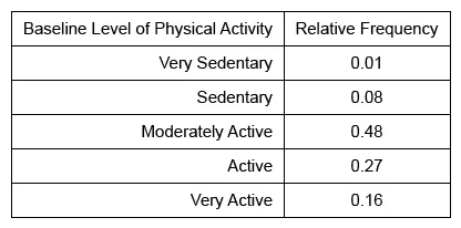 Arthur is the manager of a recently opened 24-hour gym. He wanted to know the baseline level of physical activity (PA) of new gym enrollees and decided to include a small survey in the enrollment application during a certain month. The survey asked individuals to rate their baseline level of PA as very sedentary, sedentary, moderately active, active, or very active. The relative frequency of each baseline level of PA of new enrollees who completed the survey is shown in the table below.