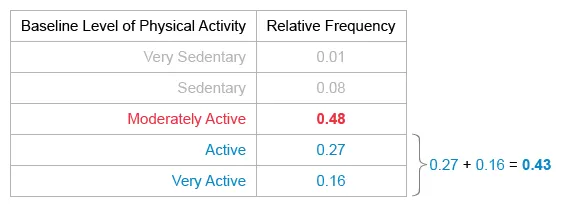 Notice that the proportion of new enrollees reporting a moderately active baseline PA level is 0.48 and that the proportion reporting an active or very active baseline PA level is 0.27 + 0.16 = 0.43.