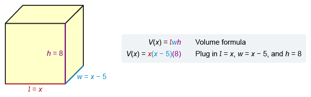 To match the answer choices, rearrange to see that the function for the volume of the prism in terms of the length of its base is V(x) = 8x(x − 5).
