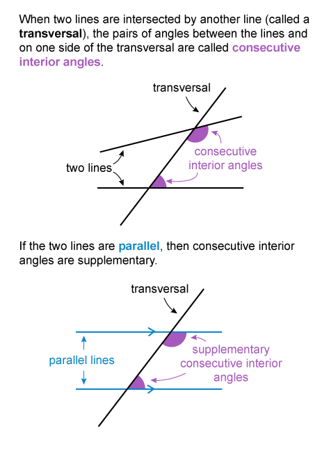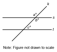 Notice that the angles marked b° and c° are on the same side of transversal k and that they are between parallel lines s and t, so they are consecutive interior angles and must be supplementary (sum to 180°).