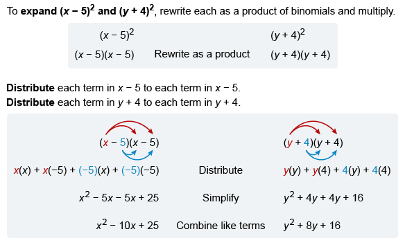 To expand (a + b)2, use the identity (a + b)2 = a2 + 2ab + b2 or rewrite the expression (a + b)2 as (a + b)(a + b) and multiply.