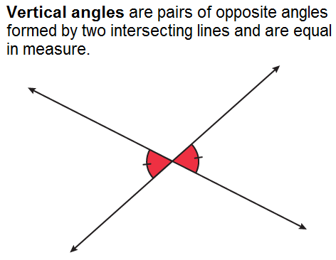 - When two lines intersect, they form pairs of vertical angles that are equal in measure.