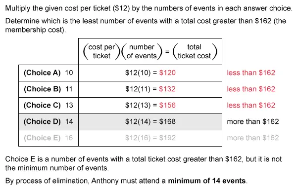 Note: It is also possible to answer the question by process of elimination. Calculate the ticket cost for each answer choice, and identify which results in the lowest amount that is greater than the membership cost (calculation).