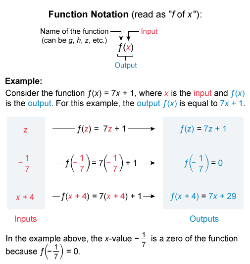 - The function notation f(x) means the output (or value) of the function f when the input is x.