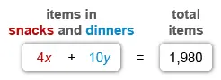The given equation represents the sum of the number of items used in snack and dinner packs that is equal to the given total items (1,980). To interpret 10, first find the meaning of 10y.