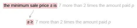 It is given that the minimum sale price of any thrift item, s dollars, is 7 more than 2 times the amount paid for that item, p dollars. Therefore, s must be greater than or equal to 7 more than 2 times the amount paid p.